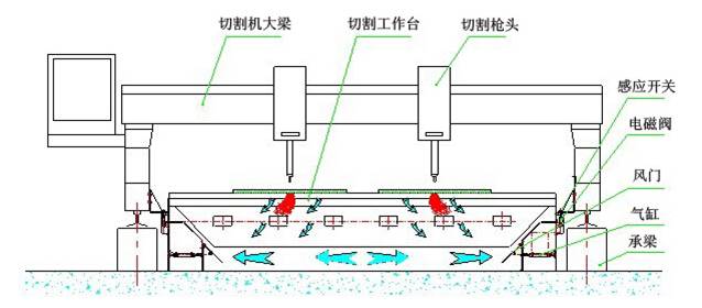 下吸式煙塵凈化系統(tǒng)抽風(fēng)是通過(guò)下吸式抽風(fēng)切割臺(tái)來(lái)實(shí)現(xiàn)的,下吸式抽風(fēng)切割臺(tái)分成若干個(gè)區(qū)域,每個(gè)區(qū)域設(shè)計(jì)有風(fēng)門吸風(fēng),切割槍頭在每個(gè)區(qū)域切割時(shí),相應(yīng)區(qū)域的風(fēng)門打開(kāi)抽風(fēng),將切割機(jī)的粉塵吸除。
