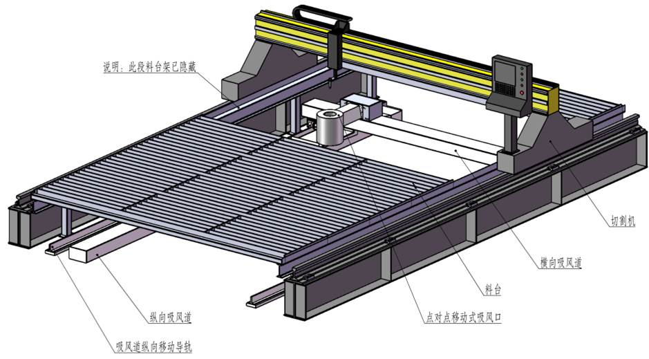 側(cè)吸式煙塵凈化系統(tǒng)采用吸風(fēng)口固定在切割機(jī)龍門架上,吸風(fēng)口與吸風(fēng)道之間通過(guò)密封皮帶密封,吸風(fēng)口可隨龍門架在吸風(fēng)道上來(lái)回移動(dòng)吸風(fēng),將切割的粉塵吸除。