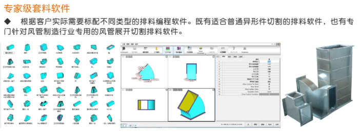 3.對于鈑金或風(fēng)管展開切割用戶:本設(shè)備可與金林鈑金、CAM-DUCT、Lantek等風(fēng)管行業(yè)專用軟件實現(xiàn)無縫對接,用戶只需在軟件中選擇鈑金件樣式、輸入簡單的參數(shù),即可自動生成展開件、自動排料、自動生成切割程序,然后調(diào)入到數(shù)控切割機中進行切割加工,使鈑金切割工作更便捷、更高效。